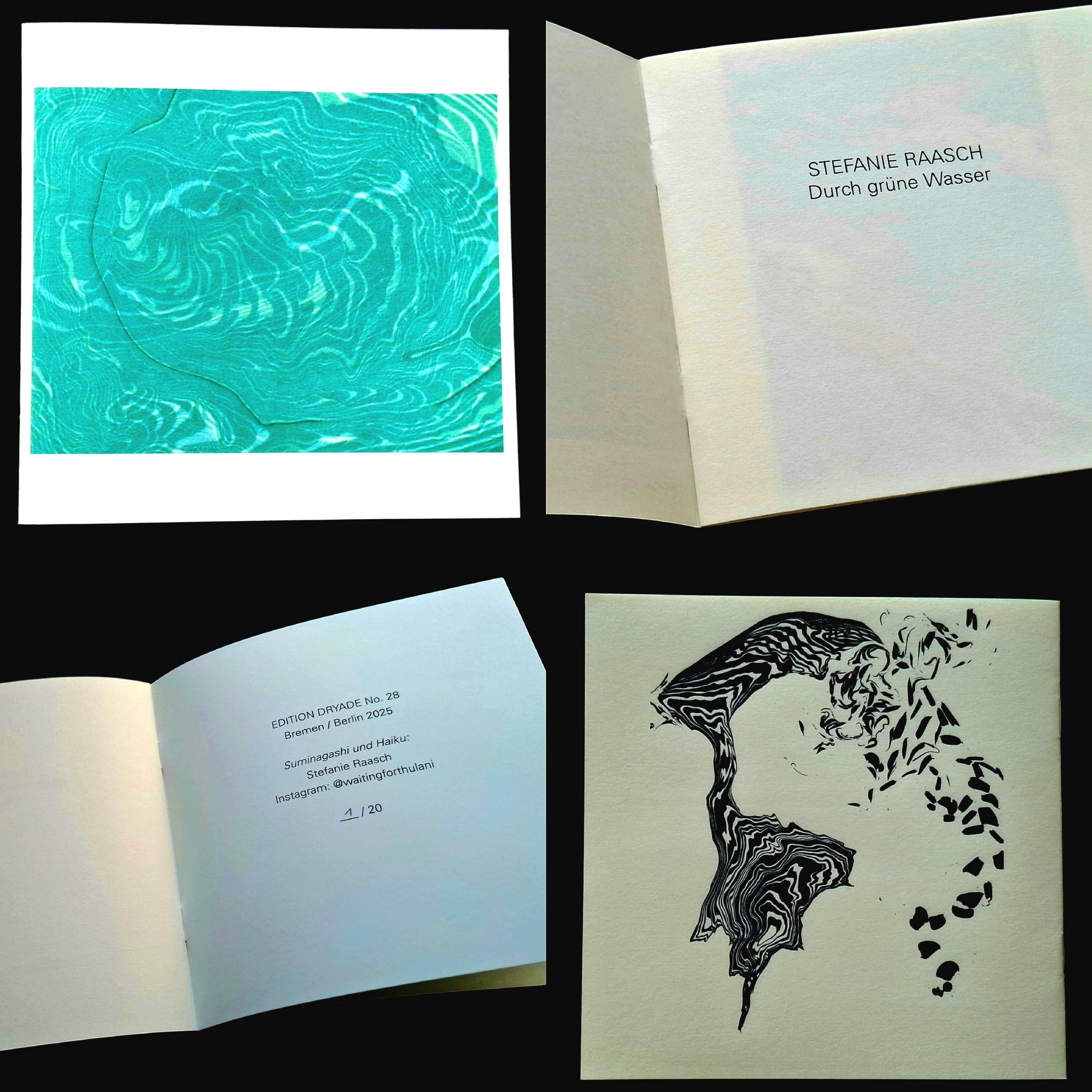 Edition Dryade No. 28 / „Durch grĂ¼ne Wasser“/ Suminagashi and Haiku, Stefanie Raasch / stapled brochure, 15×15 / 16 pages, edition of 20 hand-numbered copies (number selection is by chance)